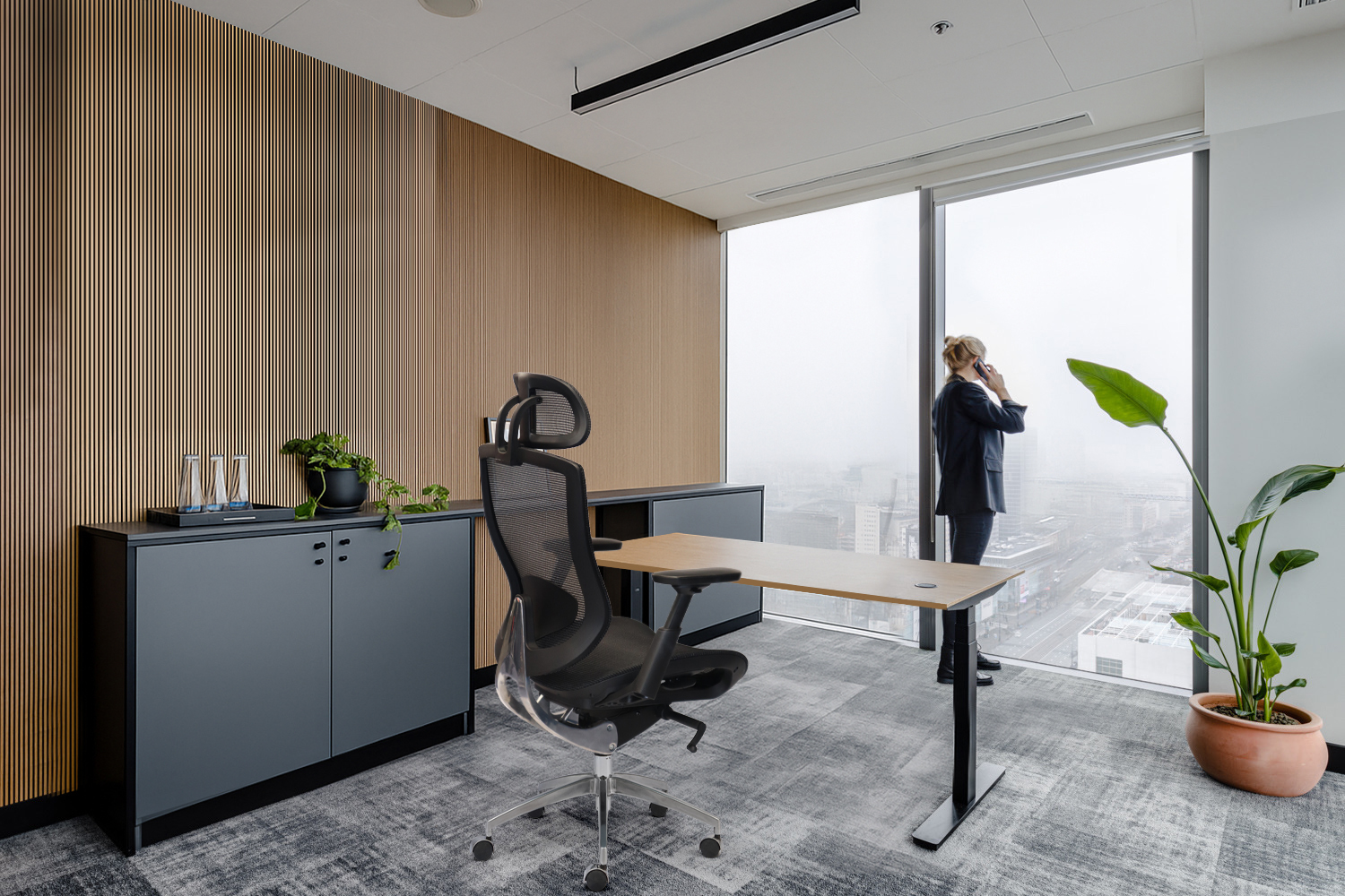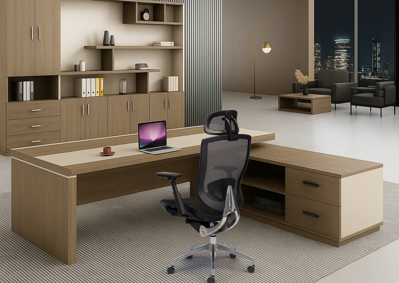 Khi bàn lãnh đạo và ghế công thái học được phối cùng tone (gỗ – da – kim loại), không gian trở nên hài hòa và quyền lực.