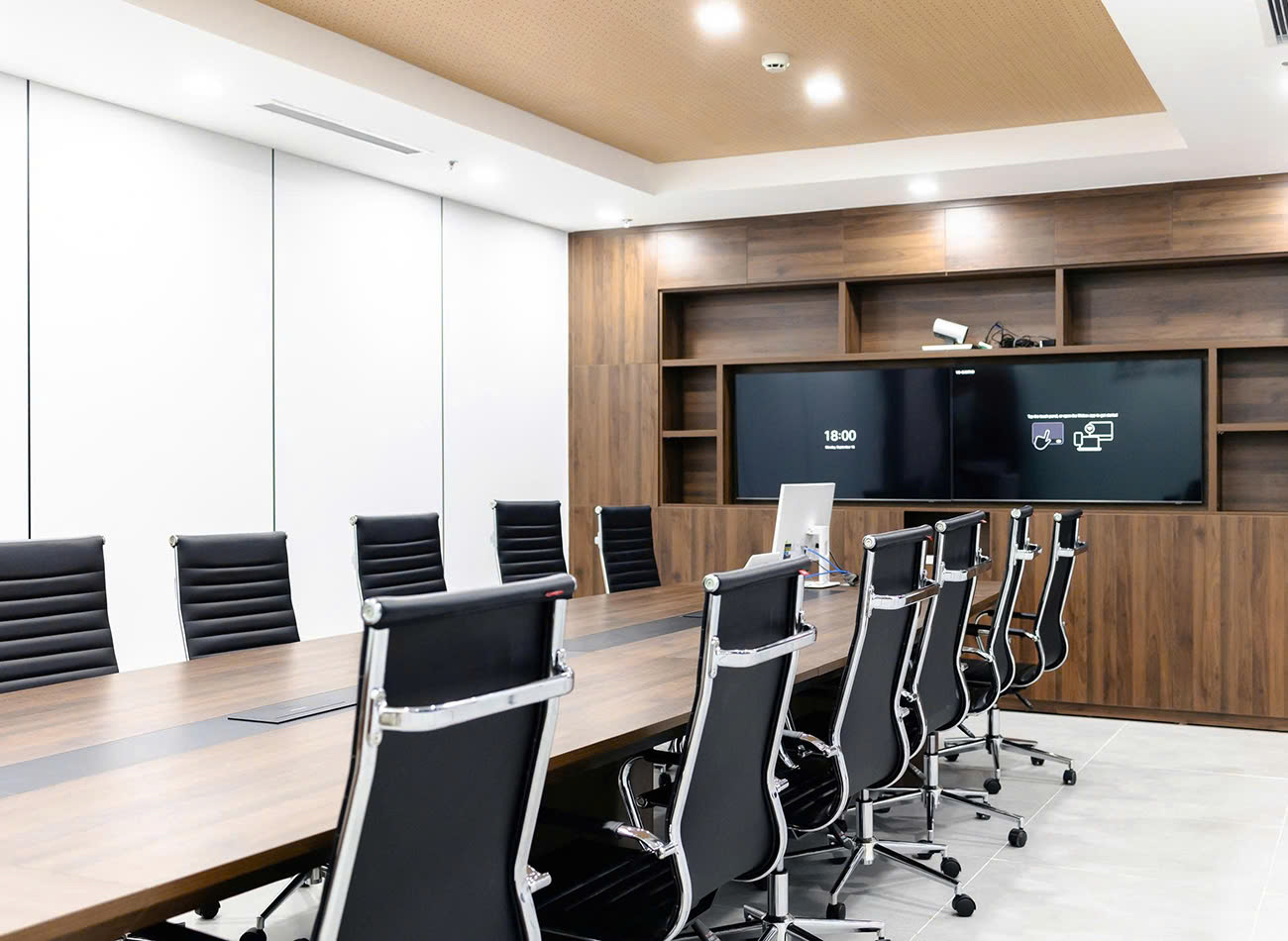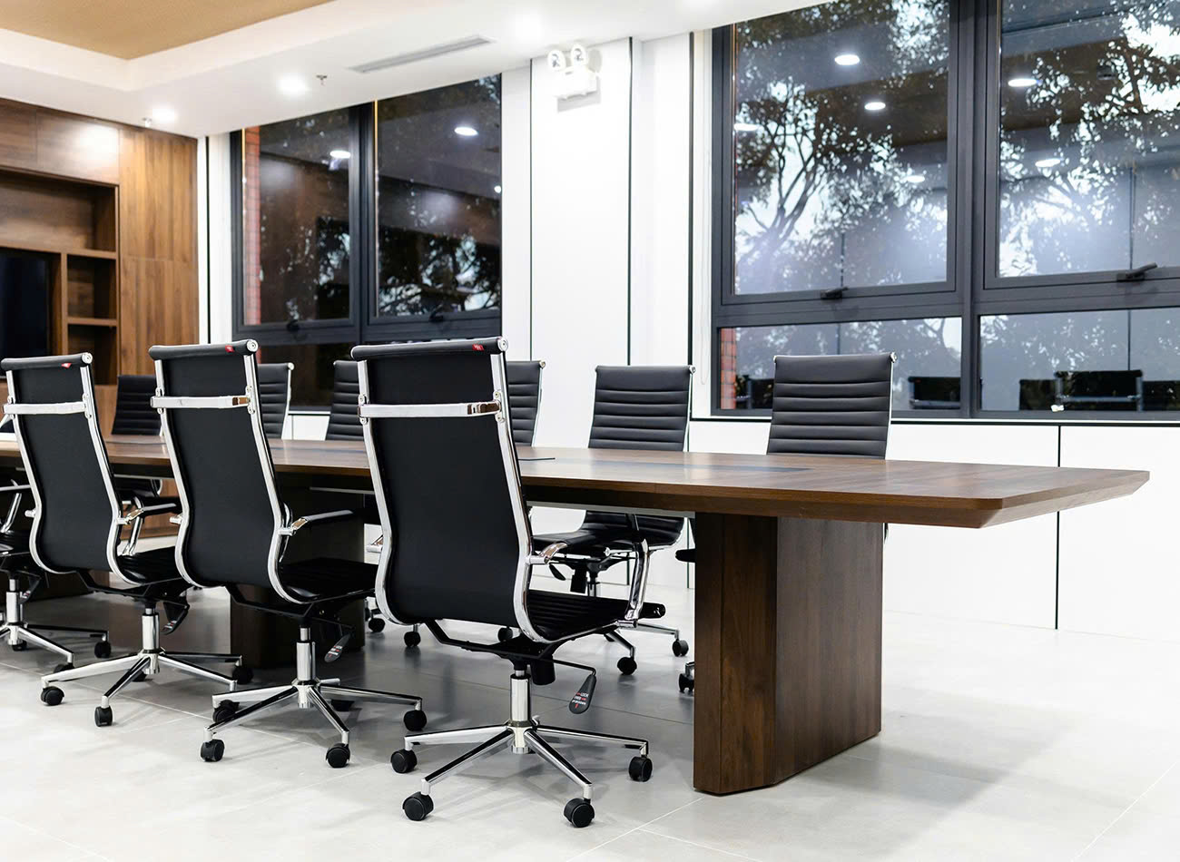 Phòng họp lớn với bàn boardroom và ghế da cùng hệ tủ màu trầm tôn lên sự sang trọng và uy tín.