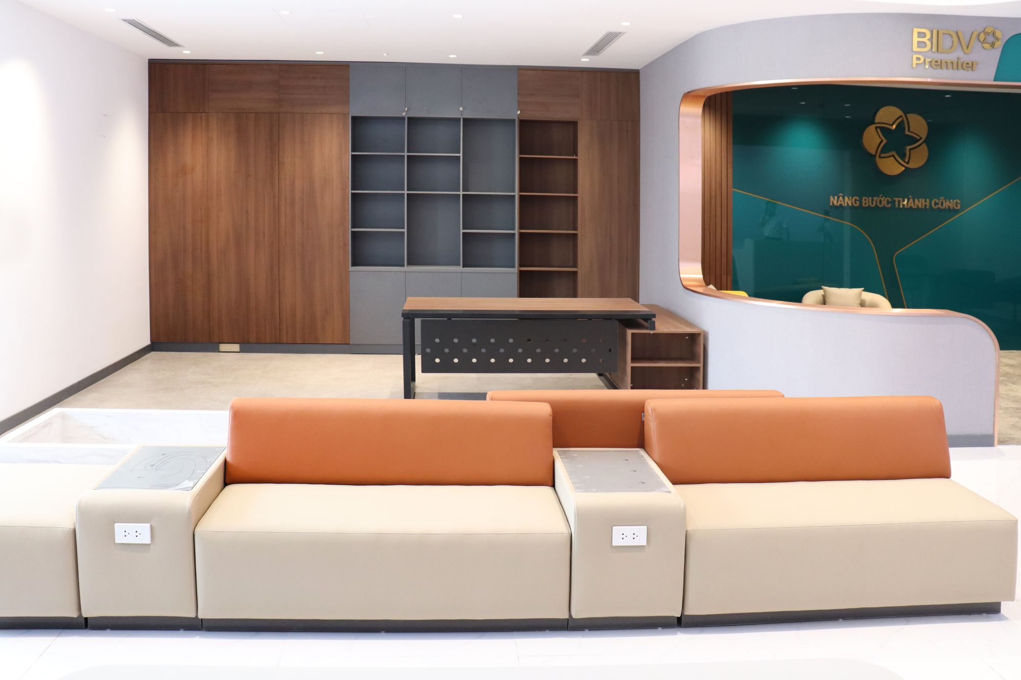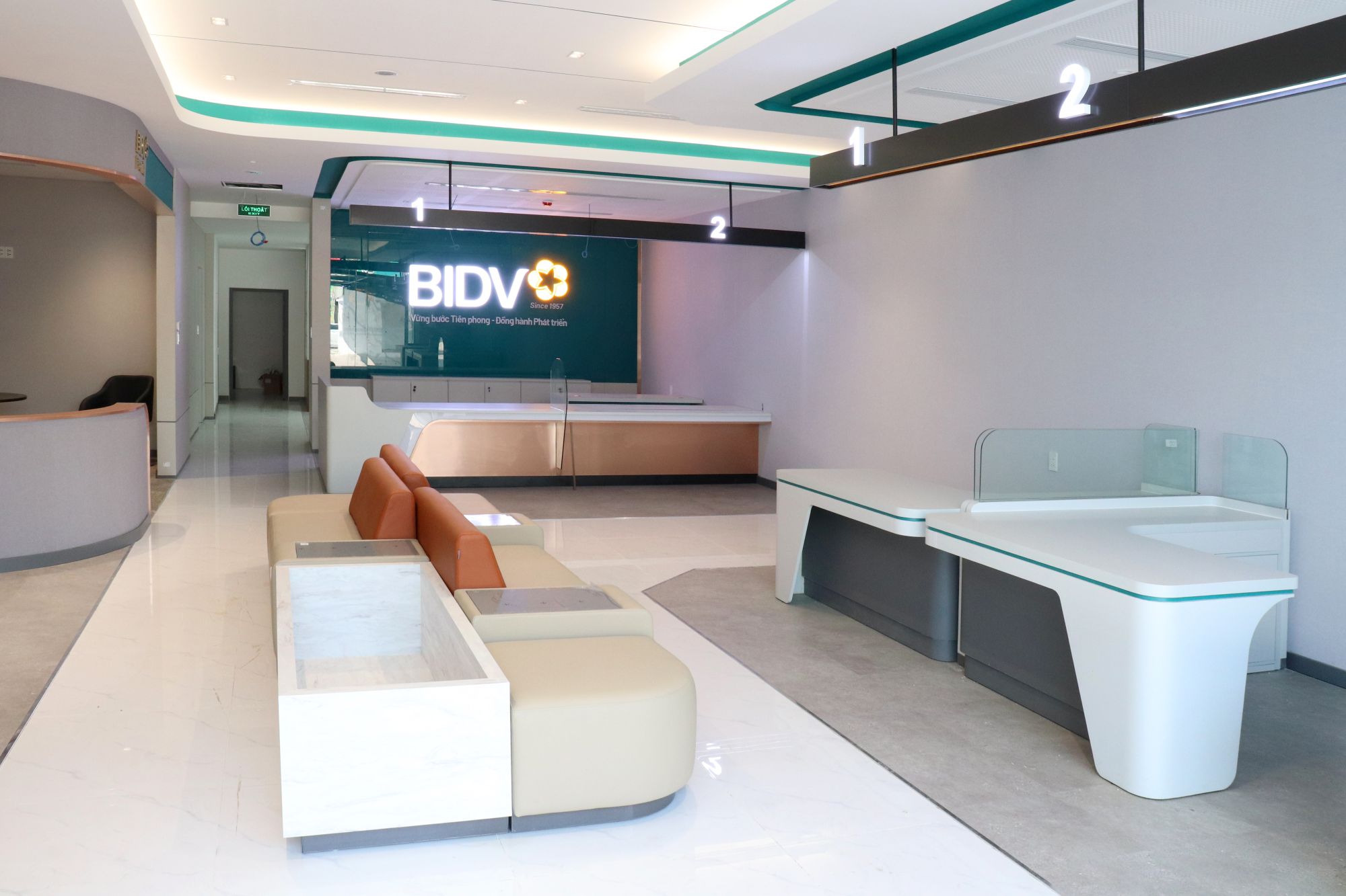 Phong cách thiết kế: Tập trung vào sự tối giản nhưng tinh tế, lấy màu xanh đặc trưng của BIDV làm điểm nhấn trên nền trung tính của nội thất cao cấp.