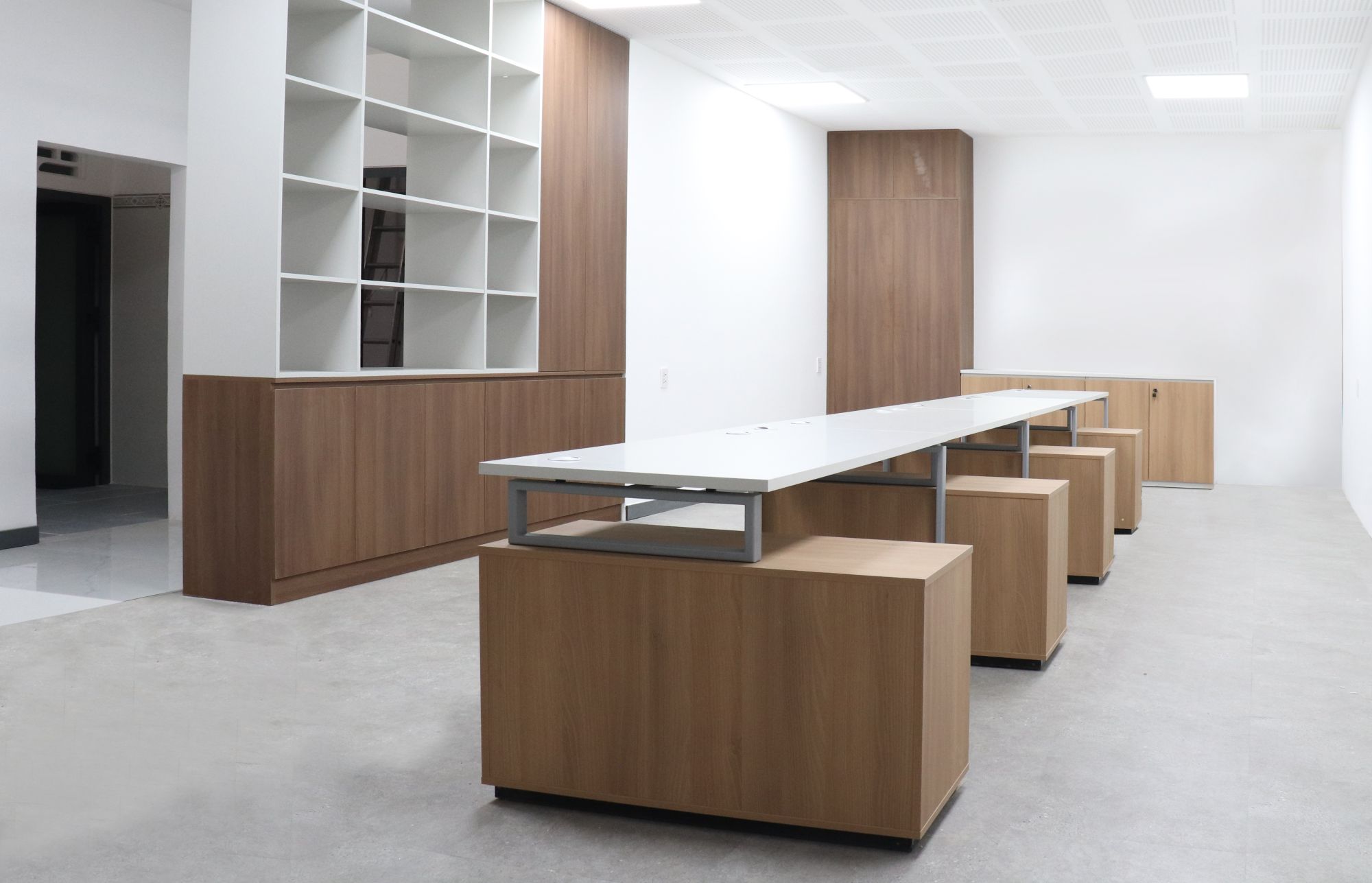 Phòng làm việc: Sử dụng hệ thống module bàn làm việc linh hoạt, tối ưu hóa diện tích và thúc đẩy sự tương tác giữa các bộ phận.