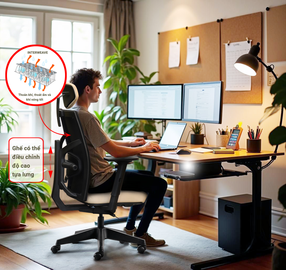 Kết hợp bàn làm việc và ghế công thái học để tối ưu tư thế.