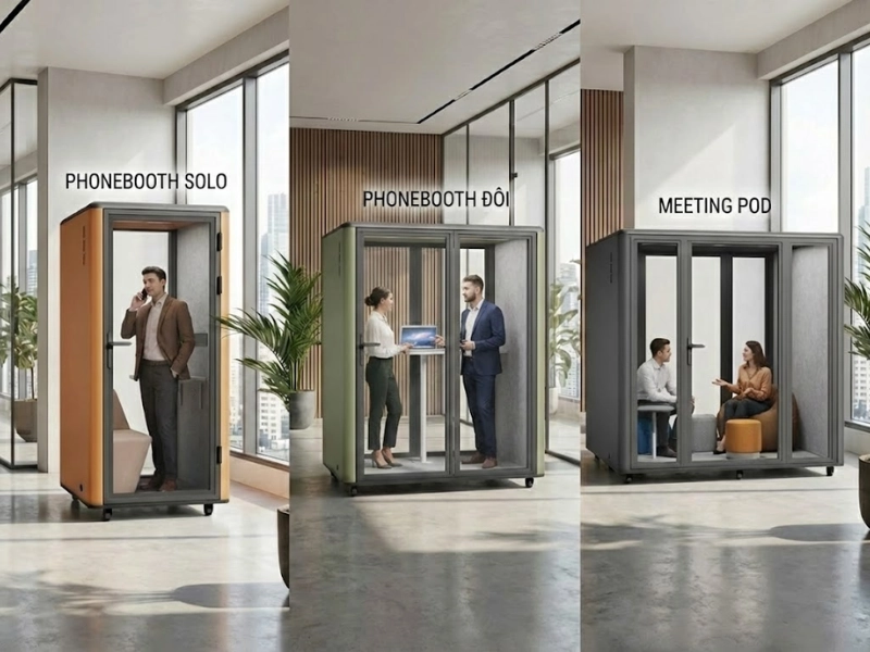 Phonebooth văn phòng (hay còn gọi là Acoustic Pod/Cabin cách âm) là một trạm không gian độc lập, được thiết kế dưới dạng cấu trúc module lắp ghép. Đây được ví như những "ốc đảo yên tĩnh" đặt ngay trong lòng văn phòng mở, giúp ngăn cách tiếng ồn môi trường và tạo không gian riêng tư tức thì.