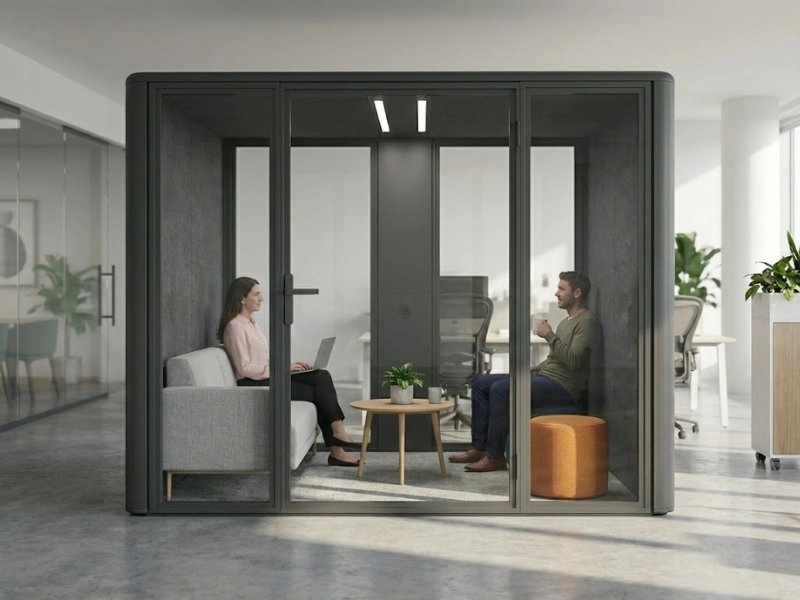 Smart Pod không chỉ phục vụ cá nhân mà còn là nơi họp nhóm (Meeting Pod). Khi quy hoạch các Pod lớn, hãy biến khu vực xung quanh thành một "Lounge chờ" tiện nghi để điều tiết luồng người.