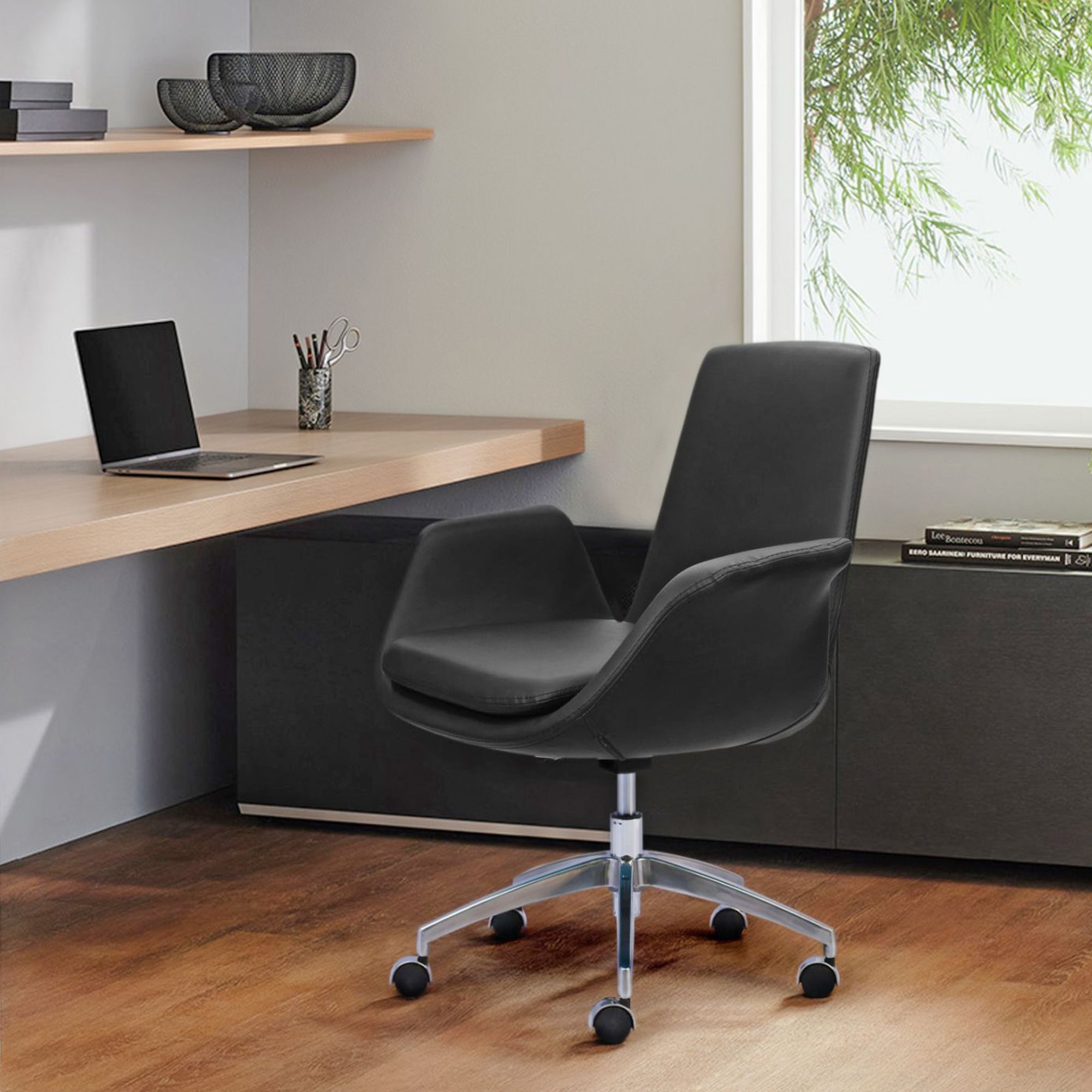 Không còn là những chiếc ghế xoay đơn điệu, mẫu ghế nhân viên bọc da vegan đang là xu hướng tại các văn phòng khách sạn 5 sao. Chất liệu da mềm mại, thân thiện môi trường cùng phần khung kim loại sơn tĩnh điện mang lại cảm giác cao cấp.