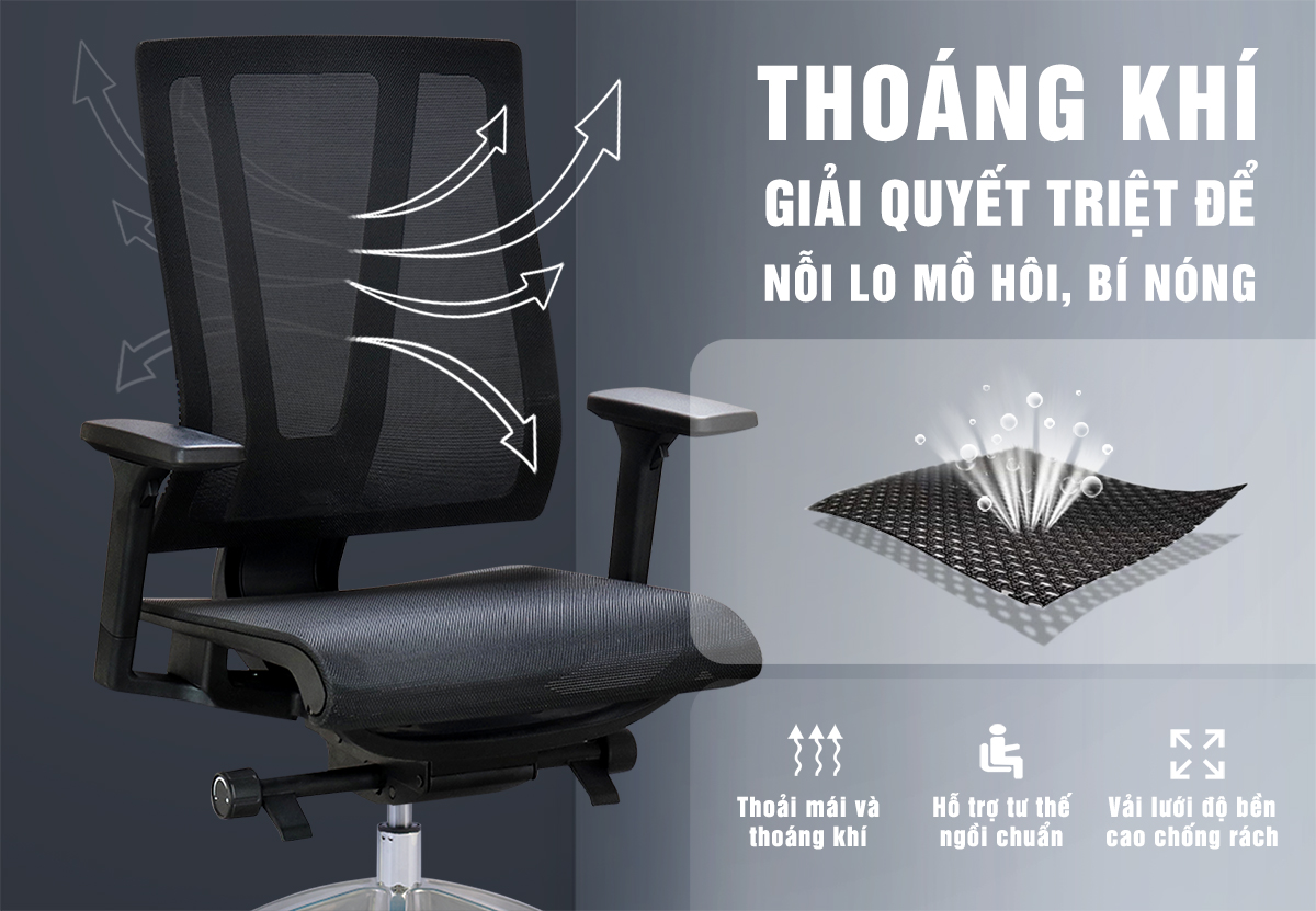 Điểm cộng lớn nhất của ghế văn phòng lưới chính là phần tựa lưng và đệm ngồi được làm từ chất liệu lưới cao cấp, thoáng khí vượt trội so với da hay nỉ. Nhờ vậy, dù ngồi lâu nhân viên cũng không bị hầm nóng, lưng luôn khô ráo, dễ chịu.