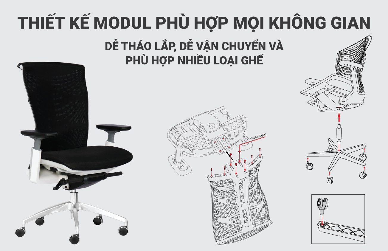 Thay vì cồng kềnh, ghế công thái học 2025 hướng đến thiết kế modul, dễ tháo lắp, dễ vận chuyển và phù hợp nhiều loại bàn (từ bàn cụm cho nhân viên đến bàn lãnh đạo cao cấp). Điều này giúp các công ty công nghệ có thể mở rộng hoặc tái cấu trúc văn phòng nhanh chóng.
